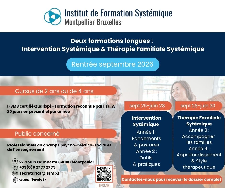 L’Institut de Formation Systémique Montpellier Bruxelles a pour vocation la transmission de Savoir, de Savoir-faire, et de Savoir-être de l’épistémologie systémique, par une approche essentiellement expérientielle. Présidé par Bernard Filleul, l’ifSmb est un carrefour d’échange de pratiques entre Montpellier et Bruxelles. Le Docteur Mony Elkaïm, pionnier de l’approche systémique et de la thérapie familiale, en est le Président d’honneur.